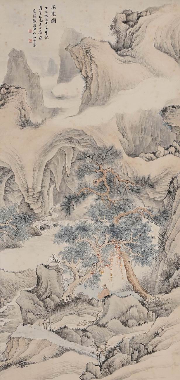 备注:款识:不老图。丁丑七月十二日,奉祝月笙仁兄五十眉寿,晋陵张穀年于四香庵。钤印:张穀年(朱白相间)、张穀之印(白)。创作年代:丁丑1937。说明:杜月笙上款。 杜月笙(1888-1951),原名月生,改名镛,号月笙。江苏沙川(今属上海)人。上海租界青帮最著名的人物。早年受青帮老大黄金荣赏识,两人与张啸林共开设三鑫公司。后担任民国陆海空总司令军事委员会少将参议、法租界公董局华董、中国红十字会副会长等职。