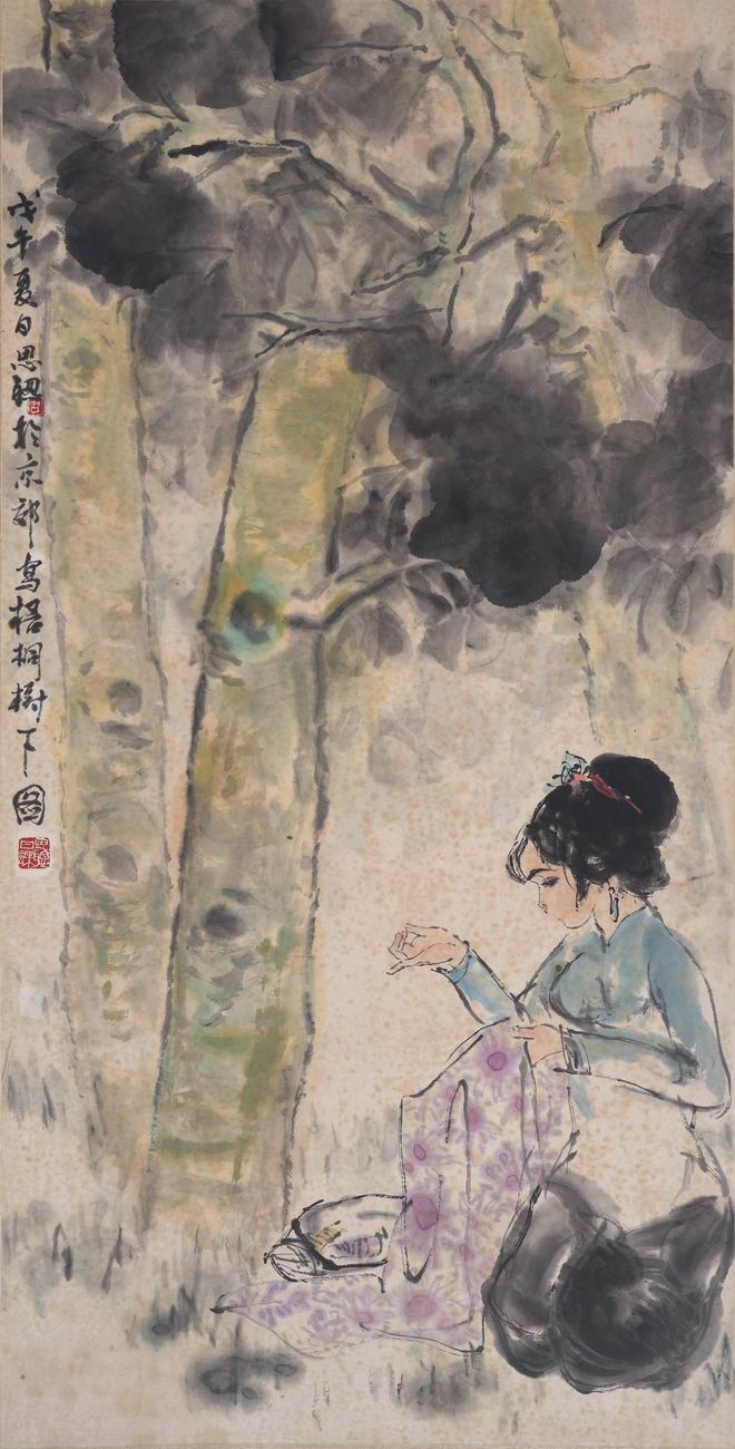 备注:创作年代:1978年作。题识:戊午夏日,思聪於京郊写梧桐树下图。印文:思聪日课、周。备注:2603bj-bl得自书画机构。