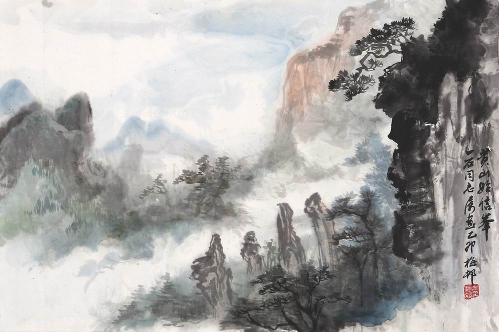 备注:款识:黄山始信峰,一石同志属画。乙卯,梅村。铃印:朱梅村印。备注:2208gz-xy得自书画机构。2412js-yz
