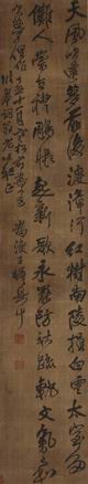 备注:款识 :天风吹远梦,前后渡漳河.红树南陵损,白云太室多.傩人崇古礼,鵰帐起新歌.永罢防秋疏,轨文气已和.吹梦俚作。己丑十一月,寒松前书为临皋词翁老公祖正.嵩渔王铎具草。钤印:王铎之印,,烟潭渔叟 。鉴藏印:伍氏澄观阁书画之印, 伍氏俪荃平生真赏。释文:天风吹远梦,前后渡漳河.红树南陵损,白云太室多.傩人崇古礼,鵰帐起新歌.永罢防秋疏,轨文气已和.吹梦俚作。己丑十一月,寒松前书为临皋词翁老公祖正.嵩渔王铎具草。说明:伍元蕙旧藏。备注:2509zj-xlys。