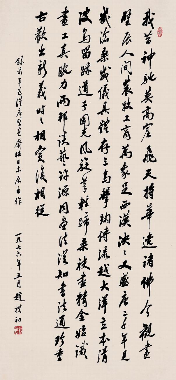 备注:题识:录前年为汉唐壁画斋往日本展出作,一九七六年五月赵朴初。印文:朴初。释文:我昔神驰莫高窟,飞天持花绕诸佛。今观画壁展人间,农牧工商万象足。西汉泱泱又盛唐,二千年见几沧桑。威仪具体存三岛,击踘传流溯大洋。立本清波鸟留迹,道子圆光风旋笔。轻蹄柔袂尽精金。始识画工真腕力。两邦谈艺许源同,画法原与书法通。珍重古欢出新义,时时相赏复相从。备注:2508bj-bl得自书画机构。