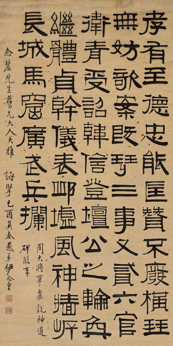 备注:题识:题识:释文略。《周大将军崔说神道碑》,临奉念农先生尊兄大人大雅诲掔,己酉(1849年)莫春,愚弟伊念曾。印文:伊念曾印、梅石。备注:2512bj-bl得自书画机构。释文:孝有至德,忠能匡赞,不废横琴,无妨欹案。既班三事,又贰六官,卫青受诏,韩信登坛。公之轮焕,继体贞干,仪表丘墟,风神墙岸。长城马窟,广武兵栏。周大将军崔说神道碑。临奉念农先生尊兄大人大雅诲腕,己酉暮春愚弟伊念曾。